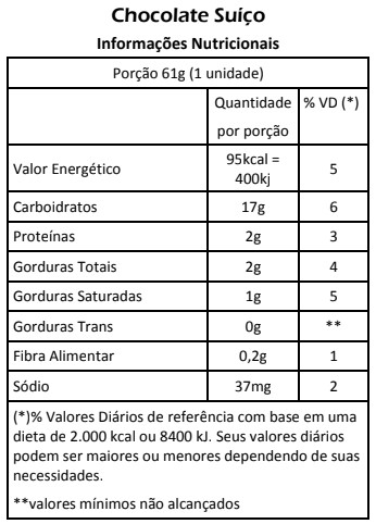 Ingredientes: Leite integral, açúcar, glicose, aroma artificial de chocolate, leite em pó integral, cacau em pó, emulsificante e estabilizante.
