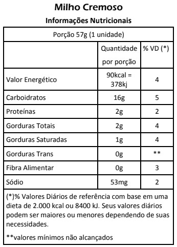 Ingredientes: Leite integral, açúcar, milho verde, glicose, leite em pó integral, aroma artificial de milho, emulsificante e estabilizante.
