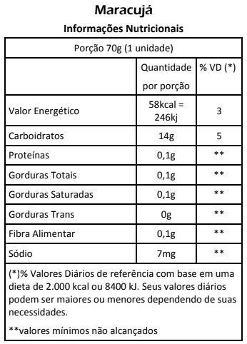 Ingredientes: Água, maracujá, açúcar, glicose, sabor artificial de maracujá, emulsificante e estabilizante.