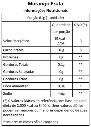 Ingredientes: Água, morango, açúcar, glicose, aromaartificial de morango, emulsificante e estabilizante.